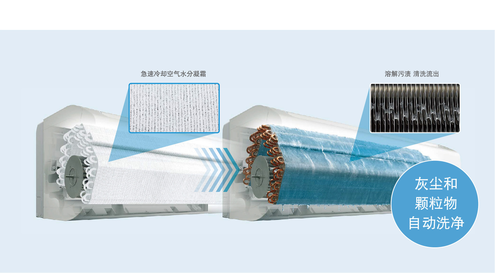 急速冷卻空氣中水分,在熱交換器周圍形成凝霜并鎖住污垢灰塵,迅速溶解化水后將污垢灰塵帶走。
