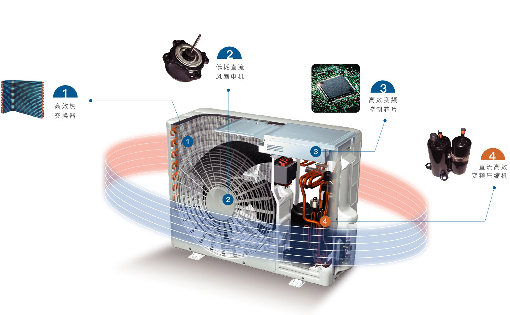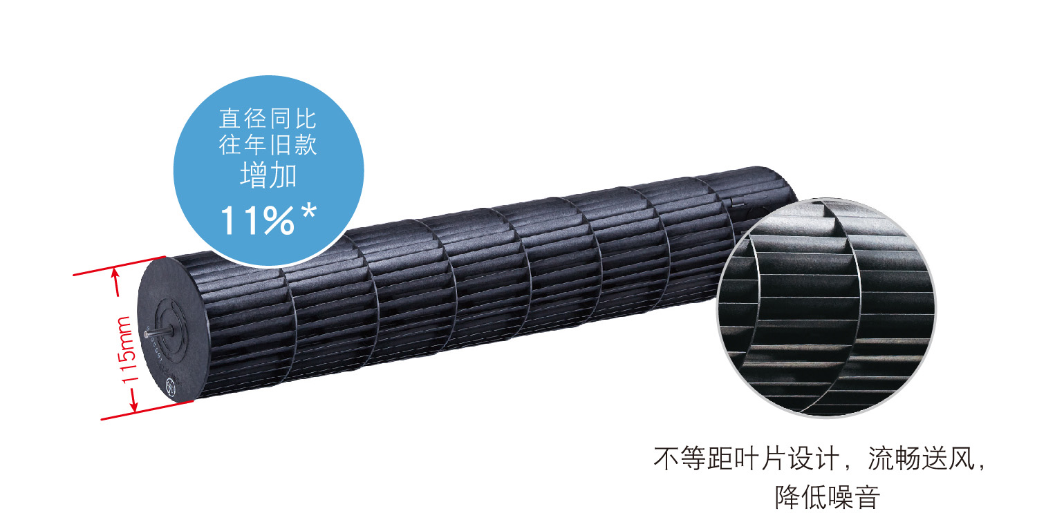 室內(nèi)機采用大直徑斜流風(fēng)葉,應(yīng)對流體力學(xué)原理對葉片進行不等距及錯位設(shè)計,風(fēng)葉運轉(zhuǎn)更流暢,風(fēng)量更大,且有效降低運轉(zhuǎn)音。